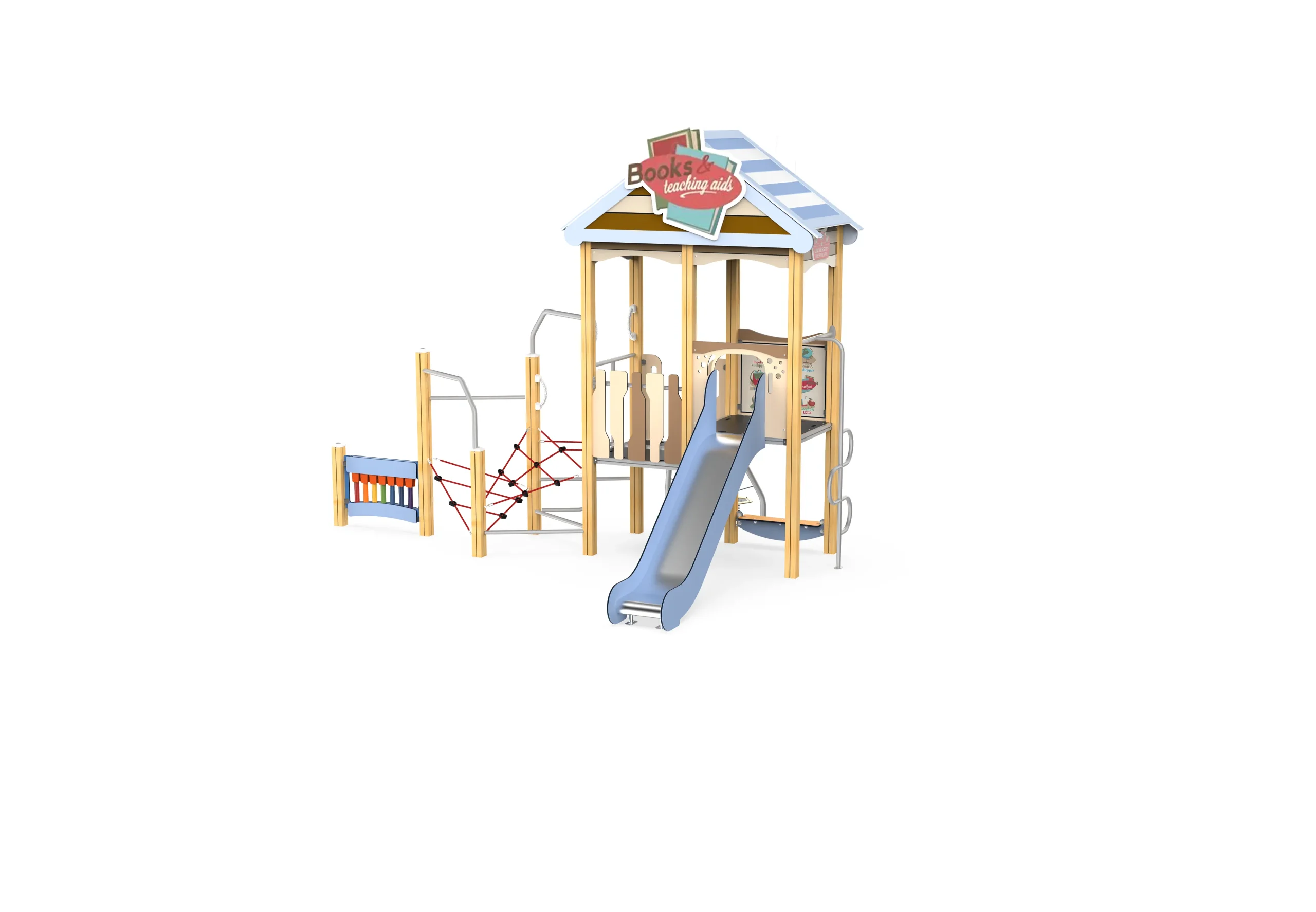 This large playground slide features a log cabin centerpiece emblazoned with a “Books” sign, showcasing a light blue striped roof paired with natural wood-toned supports. Integrated with decorative elements including book motifs and educational tool-inspired designs, it exudes a strong academic ambiance throughout.