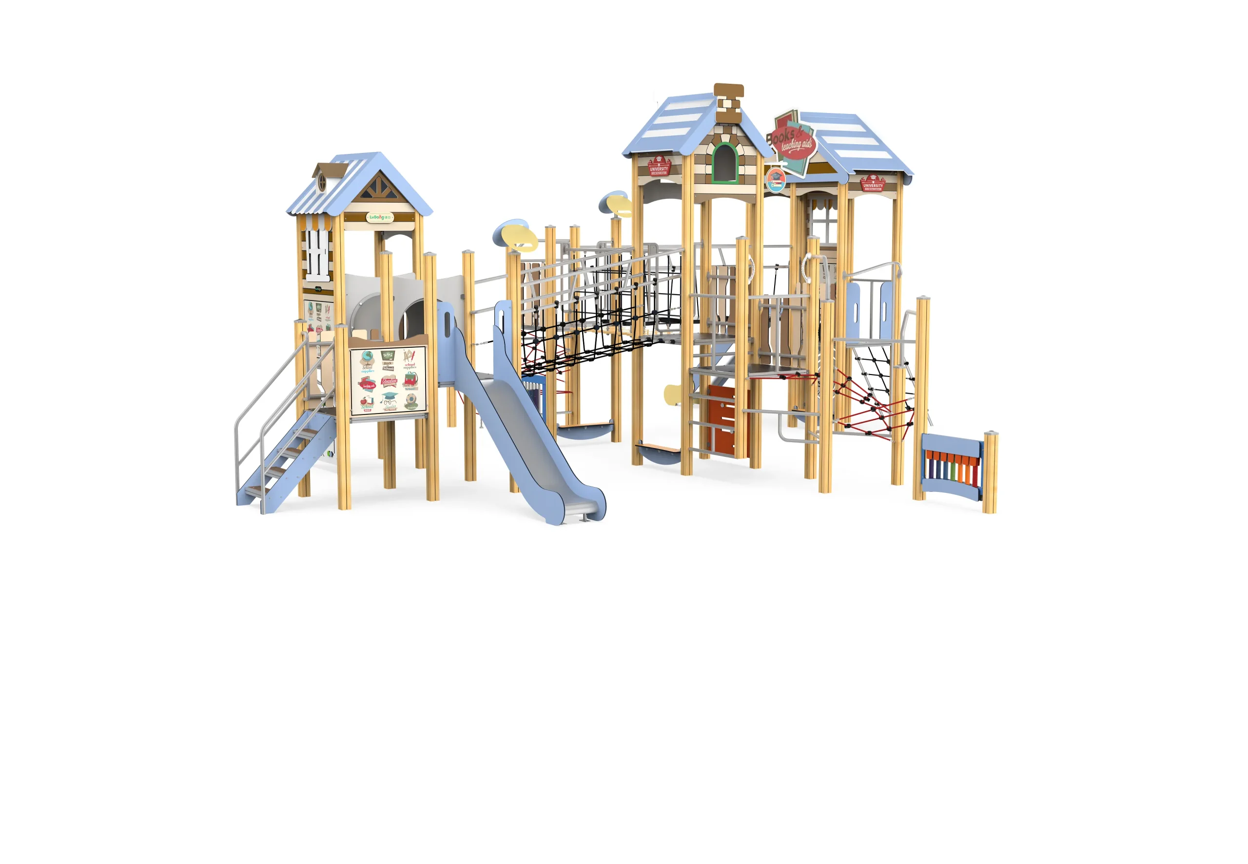 This modular playground slide is shaped like an adorable miniature log cabin, featuring a light blue striped roof paired with natural wood-toned supports. Boasting a fresh yet playful aesthetic, it is further accented with a “UNIVERSITY” sign and knowledge-themed decorative elements, perfectly aligning with the concept of academic exploration.