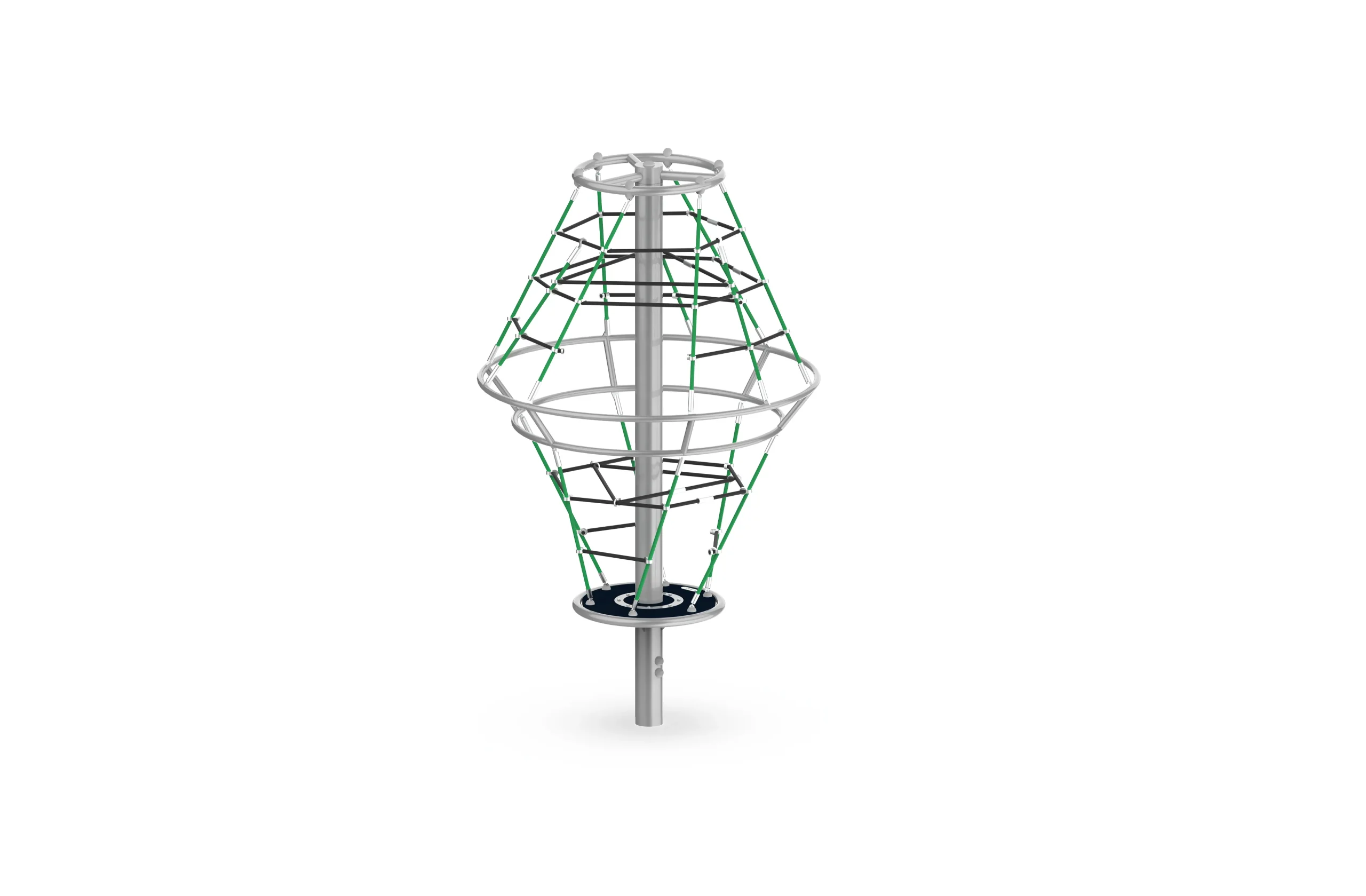 This multi-person tornado playground spinner features a “Space Cage Climber”-inspired core design. A silver-gray metal frame is paired with green and white ropes; the cage-shaped three-dimensional structure, combined with crisscross climbing poles, recreates a futuristic space exploration scenario, presenting an overall look like a rotatable 3D interactive cage. Multiple users can climb and grip both inside and outside the cage, while leveraging the spinner structure to achieve rotating interactions. It not only retains the collective fun inherent to spinners but also endows the experience with an adventurous, exploratory ambiance through its cage-style climbing elements. It is an interactive spinner installation that enables collaborative play for multiple people in community spaces.