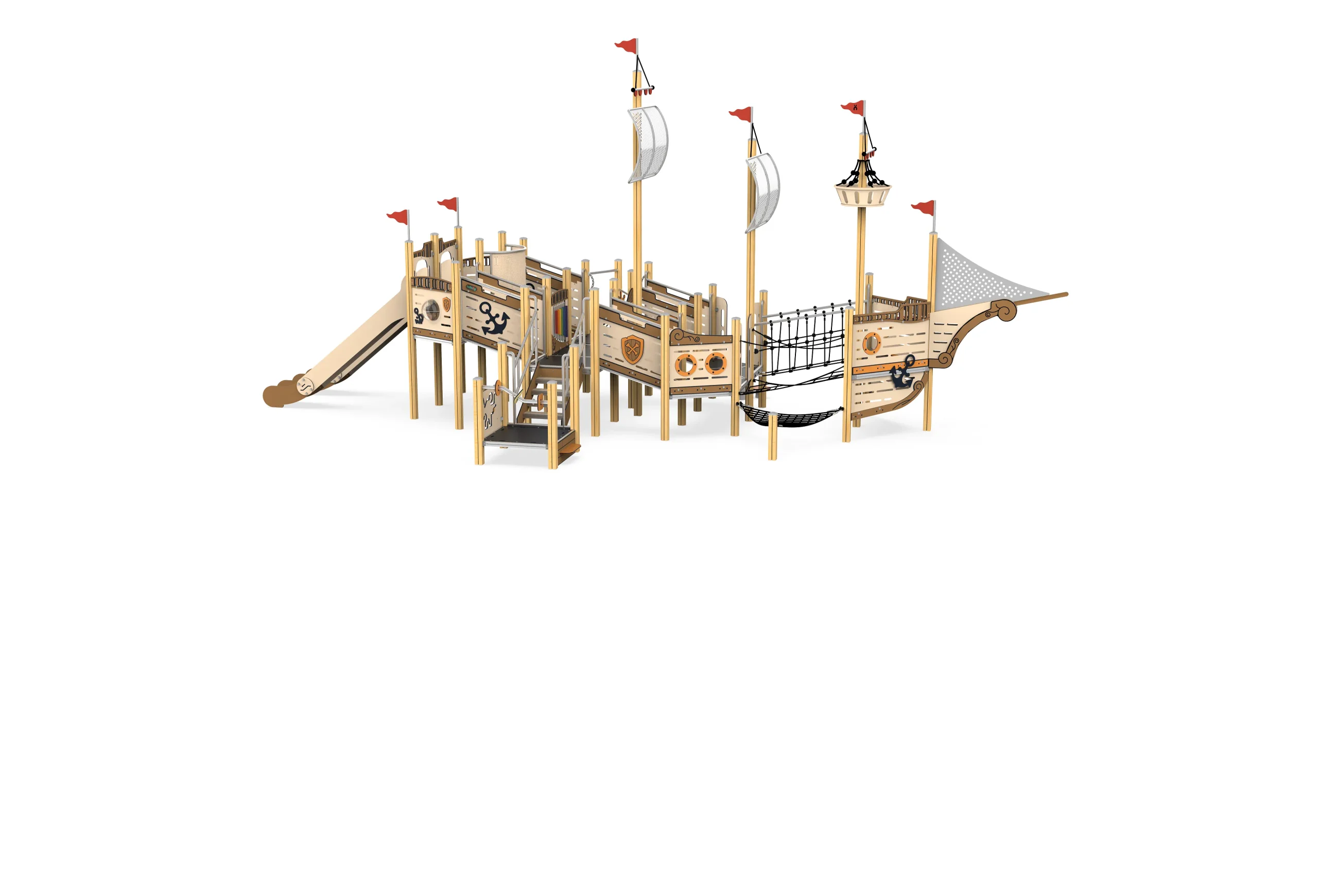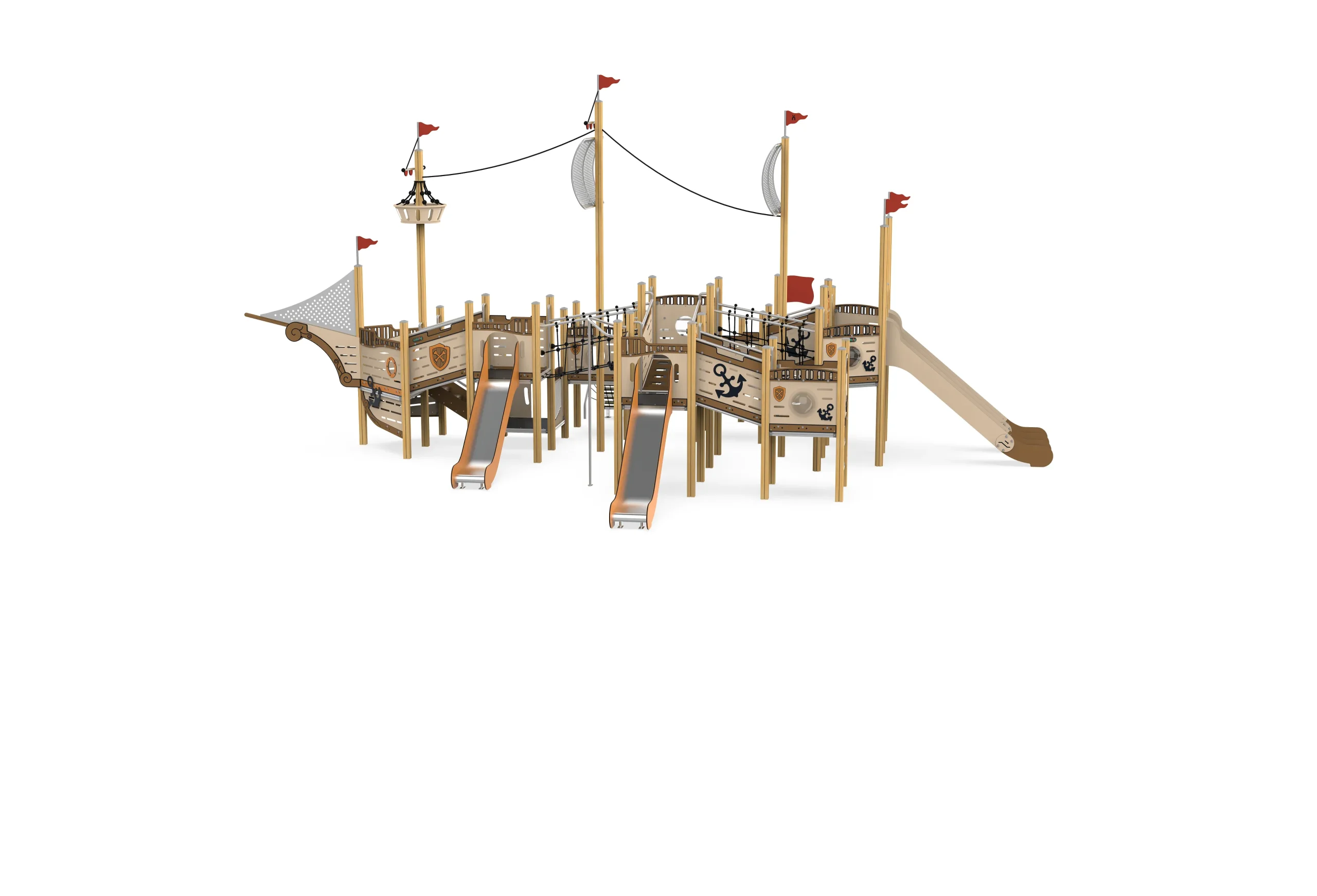 This large-scale pirate ship-themed playground equipment slide features natural timber supports paired with a wood-like hull finish. It authentically recreates classic pirate ship details, including billowing sails, a ship’s wheel, anchor ornaments, and a towering crow’s nest, while also incorporating rope-net passages and cabin platforms. Resembling a docked vintage pirate vessel, it exudes a strong sense of swashbuckling adventure.